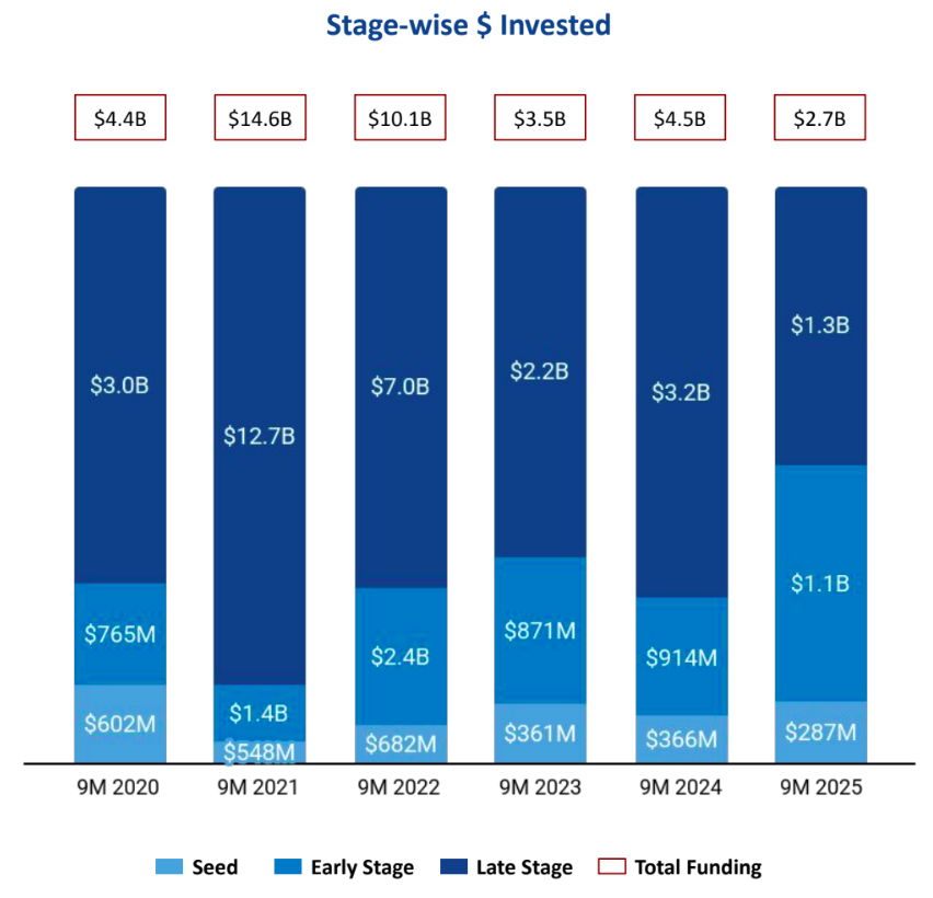 A total of $2.7B was raised in 9M 2025, representing a 40% drop compared to $4.5B in 9M 2024, and a 23% decline compared to $3.5B raised in 9M 2023. The period witnessed a noticeable slowdown in large-ticket rounds, impacting overall capital flow into the ecosystem.