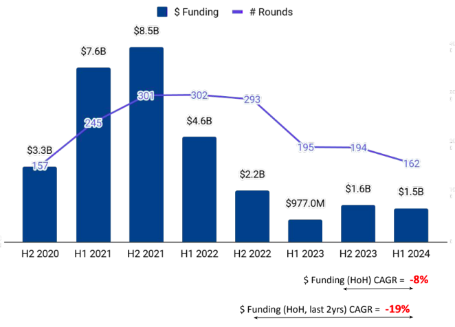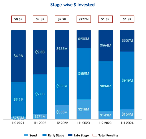 Seed-stage funding stood at $164 million in H1 2024, a decline of 24.8% from the $218 million raised in H1 2023. Early-stage investments rose nearly 70% to $949 million in H1 2024 from $559 million in H1 2023. Late-stage investments, too, rose 78.5% to $357 million in H1 2024 from the $200 million raised in H1 2023.