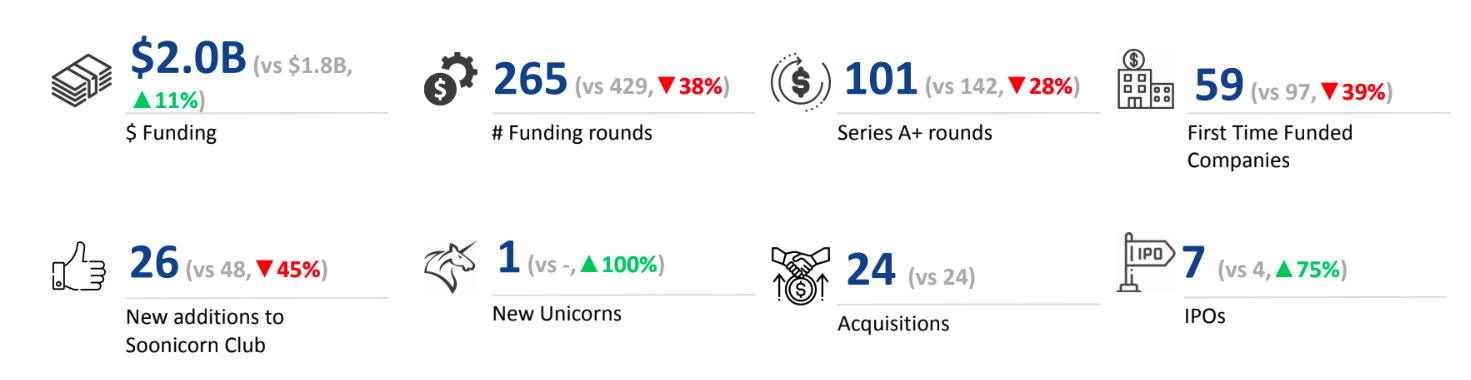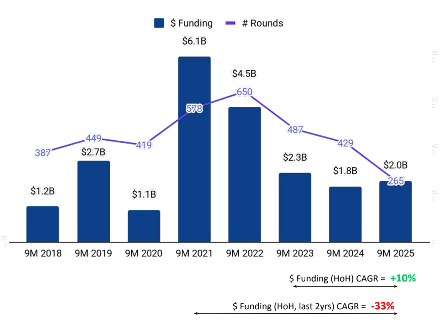 Retail, Real Estate and Construction Tech, and FinTech emerged as the top-performing sectors in 9M 2025. The Retail sector recorded $633M in total funding, reflecting a 50% increase compared to $421M in 9M 2024, and 55% growth over $408M in 9M 2023. The Real Estate and Construction Tech sector saw funding of $555M, representing a 444% surge compared to $102M in 9M 2024, and an increase of 1414% over $37M in 9M 2023. The FinTech sector recorded $477M, which is an 11% decrease compared to $533M in 9M 2024, but an increase of over 10% compared to $433M in 9M 2023.