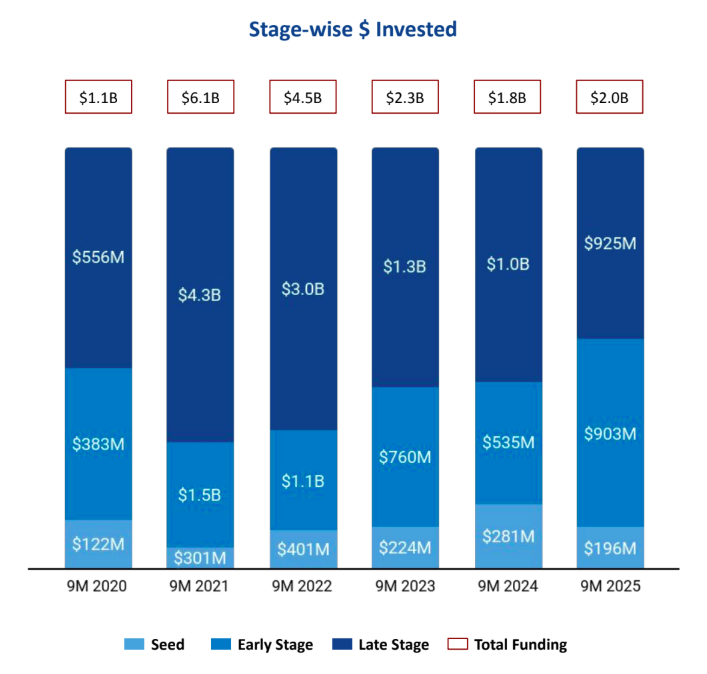 Funding activity across stages in Maharashtra displayed varied momentum in 9M 2025. Seed-stage funding stood at $196M, reflecting a 30% decline from $281M in 9M 2024 and a 12% drop from $224M in 9M 2023. Early-stage investment registered strong growth, reaching $903M, a 69% jump compared to $535M in 9M 2024 and a 19% rise from $760M in 9M 2023. In contrast, late-stage funding totaled $925M, marking a 10% decline from $1.0B in 9M 2024 and a 29% decrease compared to $1.3B raised in 9M 2023, indicating softer activity at the mature end of the market.