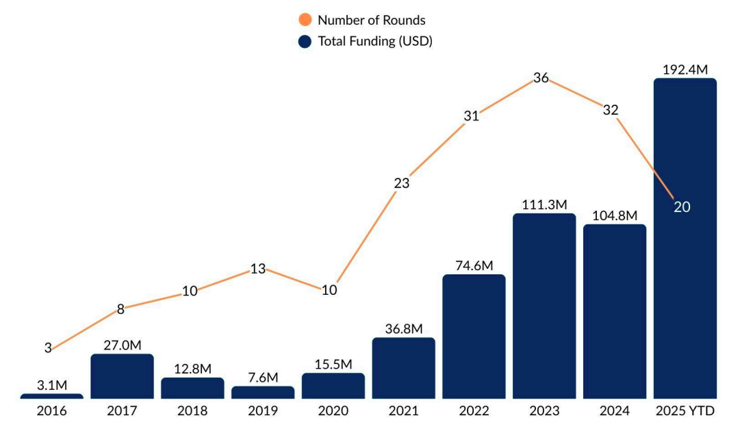 According to the report, India’s Military Tech sector has witnessed exponential growth over the last decade. Annual funding surged from $3.1M in 2016 to $192.4M in 2025 YTD, a 61-fold increase. This makes 2025 YTD the most funded year to date, driven by Raphe mPhibr’s landmark $100M Series-B round. To date, the sector has raised $611M across 211 equity funding rounds. The number of funding rounds has mirrored this growth, rising from only three in 2016 to a peak of 36 in 2023, with 20 already recorded in 2025.