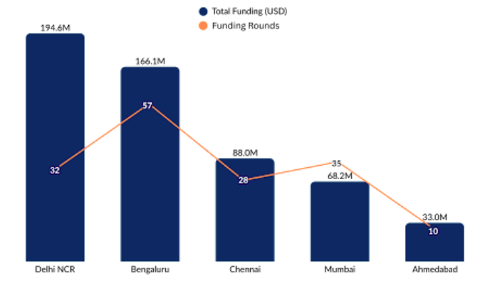 Geographically, Delhi NCR led the funding landscape in 2025, securing $194.6M in funding to date, driven primarily by Raphe mPhibr and Anadrone. Bengaluru followed as the second-largest hub, attracting $166.1M, led by Newspace Research and Technologies, Tonbo Imaging, and Sanlayan.