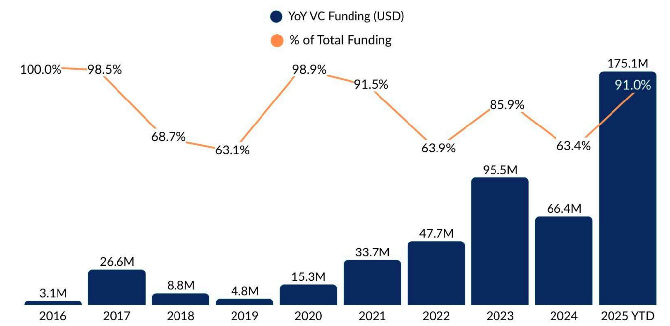 During 2016–2025 YTD, the number of first-time VCs outnumbered repeat investors in five out of ten years, reflecting an expanding investor base and the gradual mainstreaming of defence innovation. In 2025, new entrants included General Catalyst (Raphe mPhibr), Dexter Ventures and AC Ventures (Armory) and Navam Capital (Vayudh).