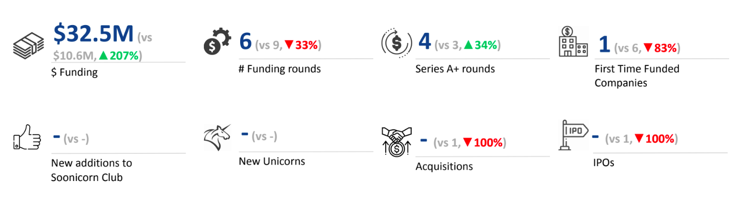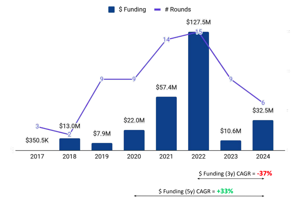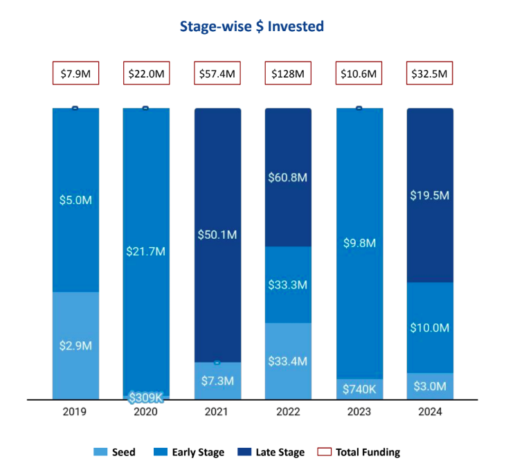 Seed-stage rounds surged 300% to $3 million in 2024, from $740K in 2023. Early-stage funding stood at $10 million in 2024, similar to 2023. Late-stage rounds worth $19.5 million were observed in 2024, with no late-stage funding recorded in 2023.