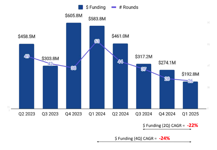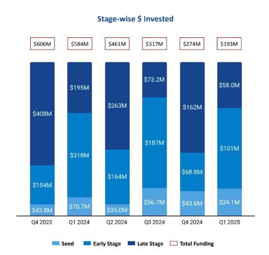 Seed-stage rounds in Q1 2025 attracted $34.1M in total funding, representing a 52% drop compared to the $70.7M raised in Q1 2024 and a 22% decline from the $43.6M raised in Q4 2024. Early-stage rounds secured $101M in funding in Q1 2025, a decrease of 68% from the $318M raised in Q1 2024, but showing an increase of 47% from the $68.8M raised in Q4 2024. Late-stage rounds witnessed a total funding of $58M in Q1 2025, experiencing a drop of 70% and 64% compared to the $195M and $162M raised in Q1 2024 and Q4 2024 respectively.