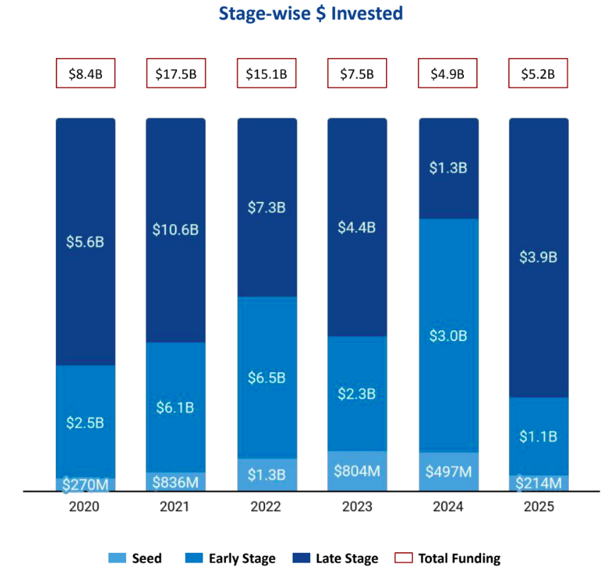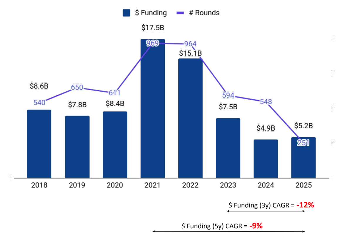 • Funding stabilized at $5.2B in 2025, marking a modest year-on-year recovery from 2024 but remaining well below 2023 levels—signaling a transition from cyclical correction to capital discipline rather than a return to expansion.