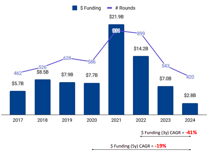 Southeast Asia (SEA) faced a challenging year in 2024, marked by a significant contraction in funding, amid a weak global economy. According to Tracxn's latest report, crafted by expert analysts, the region's tech ecosystem experienced a steep decline in financial inflows and major shifts in the market landscape while continuing to innovate and adapt to the challenges.