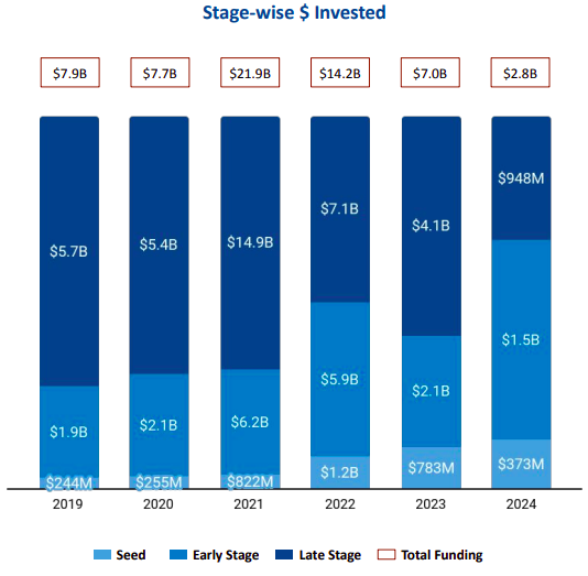SEA Tech startups raised $2.84 billion across 420 rounds in 2024 (YTD), a striking 59% decline from $7 billion in 2023 and an 80% fall compared with $14.2 billion in 2022. Late-stage investments were most impacted this year, plunging 76.9% to $948 million in 2024 from $4.1 billion in 2023. Seed funding reached $373 million in 2024, reflecting a 52.4% decline compared to $783 million in 2023. Early-stage funding amounted to $1.5 billion, registering a 28.6% decrease from the previous year.