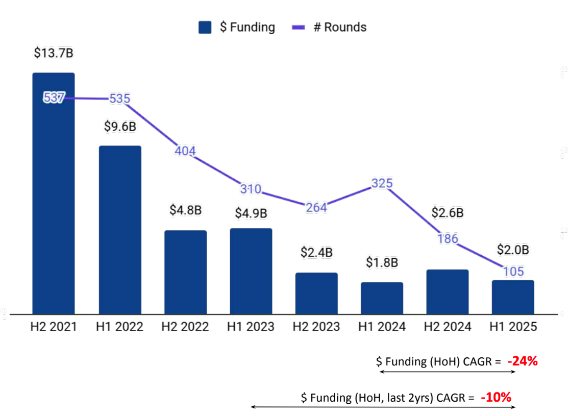 In H1 2025, total funding for the SEA tech ecosystem amounted to $2.0B, a drop of 24% compared to the $2.6B raised in H2 2024, and an increase of 7% compared to the $1.8B raised in H1 2024. These figures reflect both a short-term slowdown and a longer-term recovery trend in the regional market.