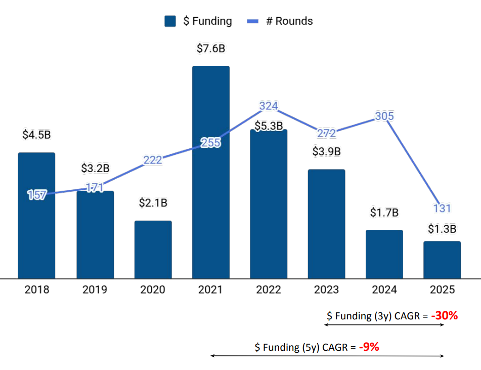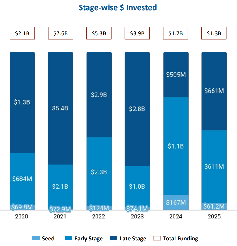 A total of $1.3B was raised by tech companies in South Korea in 2025. This represents a drop of 24% compared to the $1.7B raised in 2024 and a significant decline of 66% when compared to the $3.9B raised in 2023. The overall funding activity reflects varied movements across stages, with declines at the seed and early stages and an increase in late-stage funding compared to the previous year.
