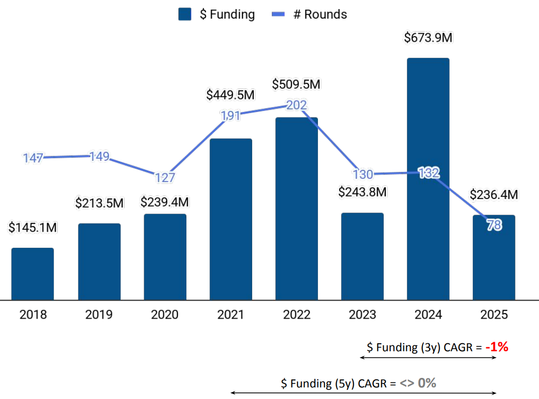 A total of $236M was raised in 2025, marking a drop of 64% compared to the $674M raised in 2024, and a drop of 3% compared to the $244 raised in 2023. This places 2025 well below the previous year’s funding levels, while remaining slightly lower than 2023, reflecting a broader pullback in investment activity within the region for the reporting period.