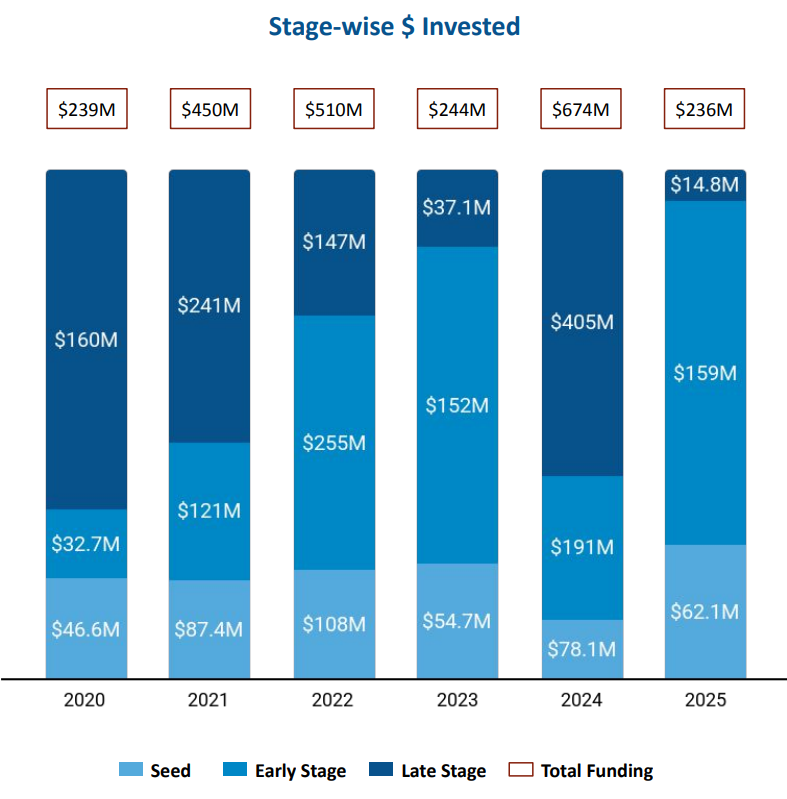 Seed Stage funding in Telangana Tech stood at $62.1M in 2025, reflecting a drop of 21% compared to $78.1M raised in 2024 and an increase of 14% compared to $54.7M raised in 2023. Early Stage funding totaled $159M in 2025, a decline of 17% compared to $191M raised in 2024 and a rise of 5% compared to $152M raised in 2023. In contrast, Late Stage funding reached $14.8M in 2025, marking a drop of 96% compared to $405M raised in 2024 and a drop of 60% compared to $37.1M raised in 2023.