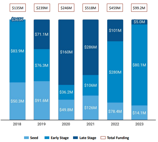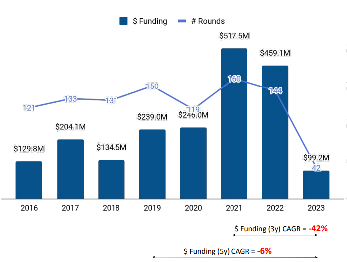 In 2023, it ranked ninth, with startups in the state raising $99.2 million. However, this is also the lowest funding the region witnessed in the last five years, a drop of 78% compared to the funding raised in 2022. This plunge in funding is primarily due to a global slowdown due to macroeconomic trends, and geopolitical factors that led to a shift in investing habits.