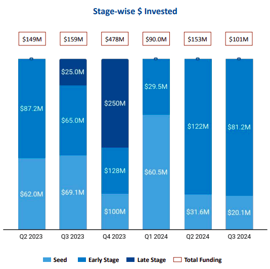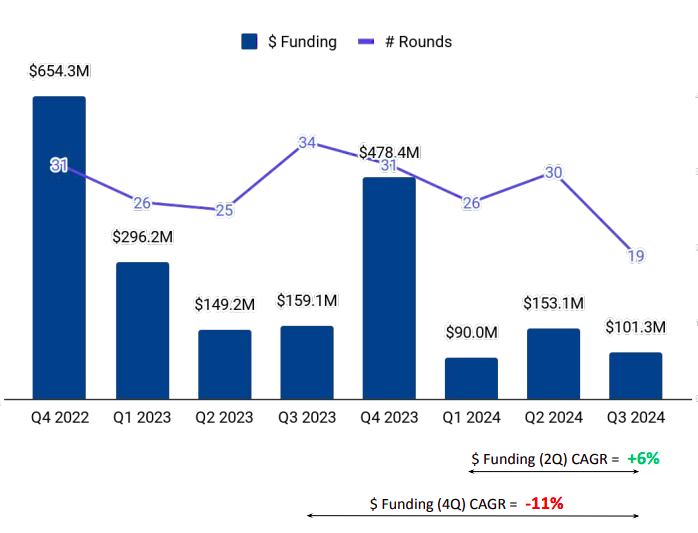 Total funding secured by UAE tech startups in Q3 2024 was $101 million, a 33.8% drop from $153M raised in the previous quarter (Q2 2024), and a 36.29% drop compared with the $159 million raised in the corresponding quarter last year (Q3 2023).