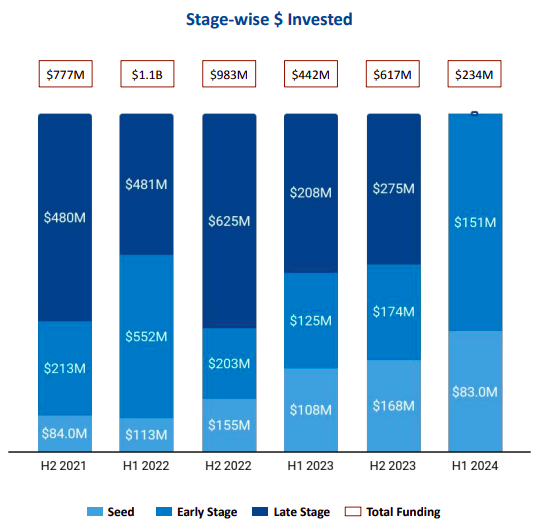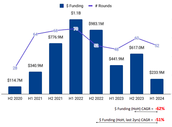 The quarter-wise trend shows some resilience. Funding rose 60% to $145 million in Q2 2024 from $90 million in Q1 2024. This is also a drop of only 3% from the $149 million raised in Q2 2023