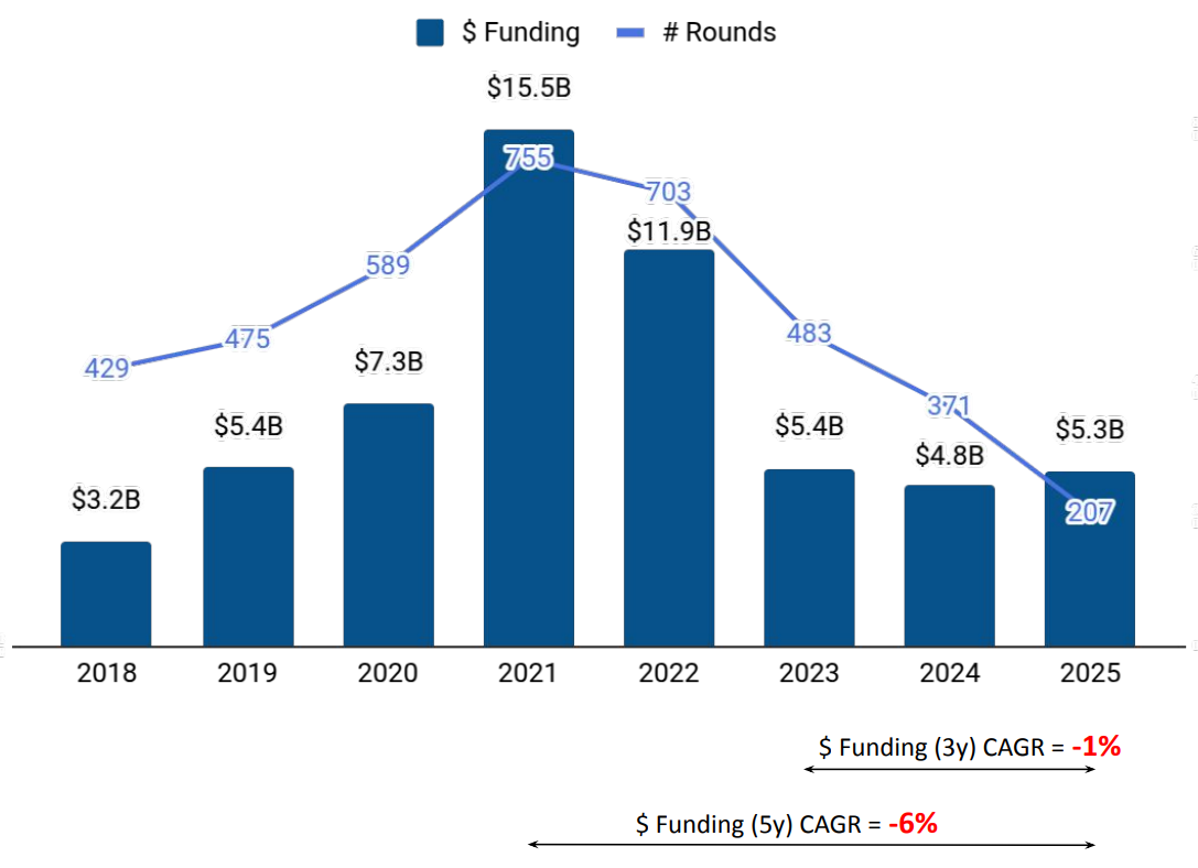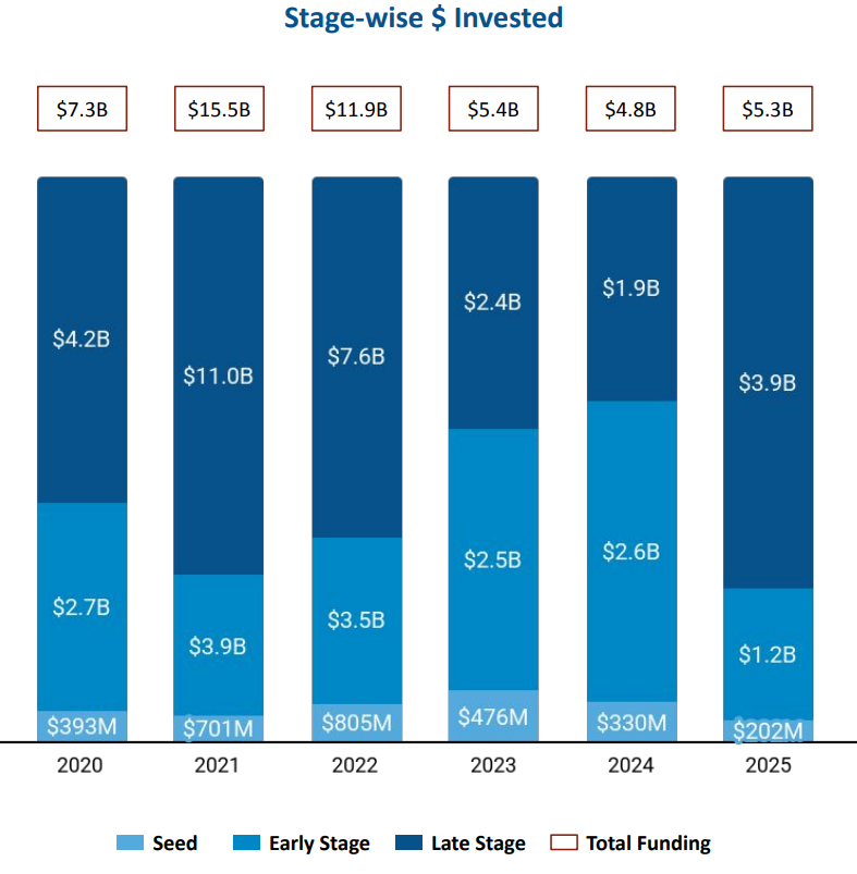 The UK FinTech ecosystem recorded $5.3B in funding in 2025, supported by a sharp increase in late-stage investments and continued activity in $100M+ funding rounds. While seed and early-stage funding declined compared to previous years, late-stage capital inflows, steady IPO activity, and a rise in acquisitions played a central role in shaping overall ecosystem activity. London continued to dominate funding distribution, and investor participation remained strong across all stages of growth.