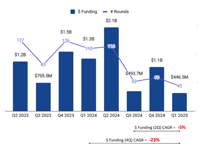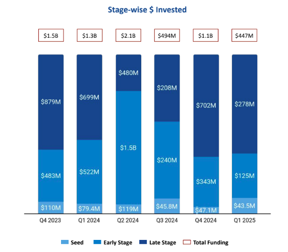 Seed-stage rounds in Q1 2025 witnessed $43.5M in funding, a decline of 45% compared to $79.4M raised during Q1 2024 and an 8% decline compared to $47.1M raised in Q4 2024. Early-stage funding in Q1 2025 totalled $125M, reflecting a sharp decline of 76% from the $522M recorded in Q1 2024 and a 64% drop from the $343M raised in Q4 2024. The funding in late-stage rounds stands at $278M, witnessing a 60% decline from $699M raised in Q1 2024 and $702M raised in Q4 2024.