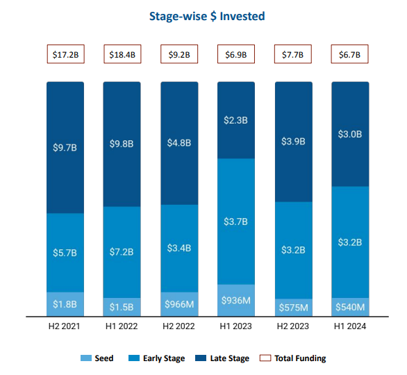 Late-stage investments stood at $3 billion in H1 2024, a 23% decline from $3.9 billion raised in the latter half of 2023 and a growth of more than 30% from the $2.3 billion raised in H1 2023. Seed-stage funding saw a total funding of $540 million in H1 2024, a drop of 7% from $575 million raised in H2 2023 and a decline of 43% raised in H1 2023. Early-stage witnessed total funding of $3.2 billion in H1 2024 and H2 2023, a 12% drop from $3.7 billion raised in H1 2023.