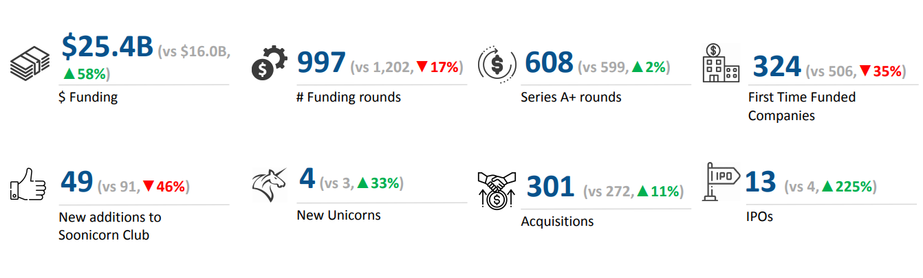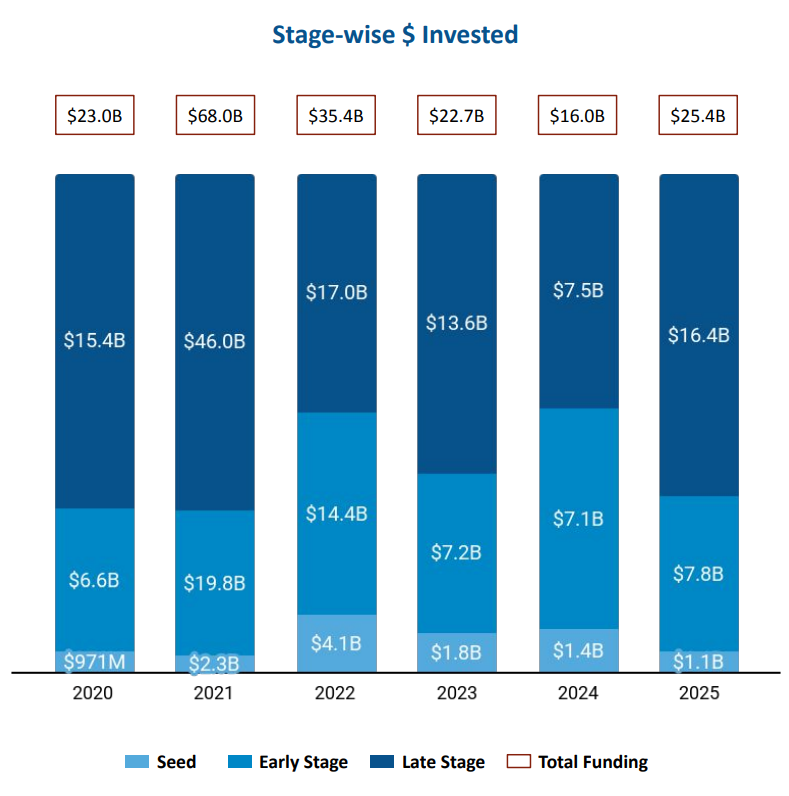 Seed-stage funding stood at $1.1B in 2025, marking a drop of 20% compared to $1.4B raised in 2024 and a drop of 40% compared to $1.8B raised in 2023. Early-stage funding reached $7.8B in 2025, rising 10% from $7.1B in 2024 and increasing 8% compared to $7.2B raised in 2023. Late-stage funding accounted for the largest share, with $16.4B raised in 2025, a rise of 118% compared to $7.5B raised in 2024 and a rise of 21% compared to $13.6B raised in 2023.