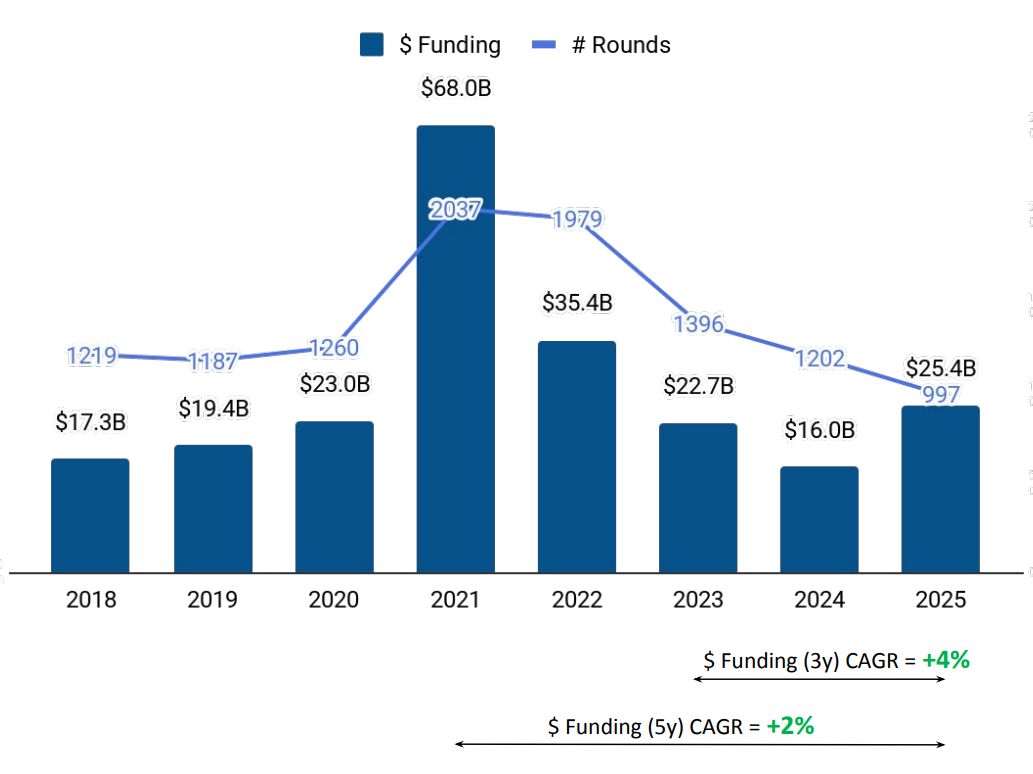 A total of $25.4B was raised by US FinTech companies in 2025, representing a rise of 58% compared to the $16.0B raised in 2024 and a rise of 12% compared to the $22.7B raised in 2023. The overall increase in funding reflects higher capital deployment across the ecosystem, supported by a greater number of large funding rounds during the year.