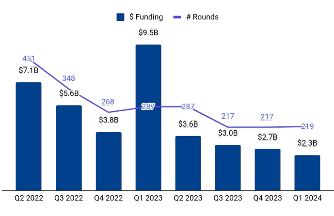 Seed-stage funding saw a slight uptick of 3% to $244 million from $238 million raised in the previous quarter. However, this is a 40% drop from the $407 million raised in Q1 2023.