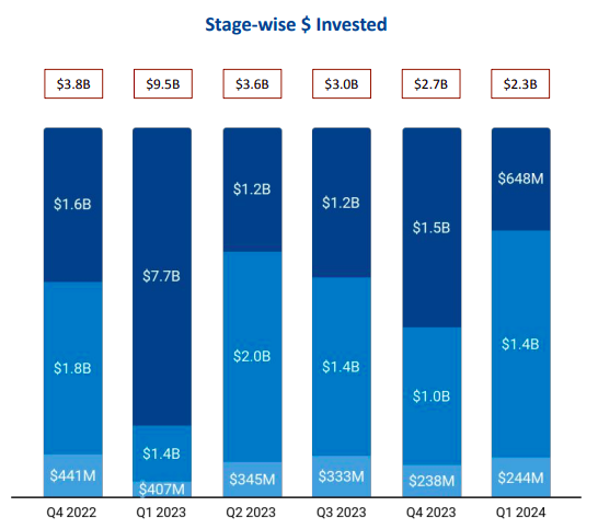 This drop in funding is majorly due to the massive drop in late-stage funding rounds. Late-stage funding Q1 2024 stood at $648 million, a 57% decline from $1.5 billion raised in Q4 2023 and a plummet of 92% compared with the $7.7 billion raised in Q1 2023.