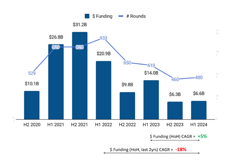 The US FinTech startup ecosystem secured total funding of $6.6 billion in H1 2024, a growth of 5% compared with the $6.3 billion raised in H2 2023 and a decline of 53% compared to the $14 billion raised in H1 2023.