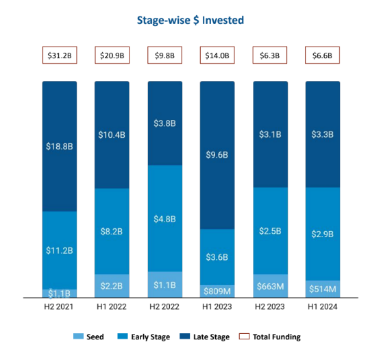 Seed-stage funding fell 36% to $514 million in H1 2024 from $809M raised in the first half of 2023. Early-stage investments stood at $2.9 billion in the first half of 2024, a 19% decline from the $3.6 billion raised in H1 2023. The sector attracted late-stage funding of $3.3 billion in H1 2024, a 66% plunge compared with the $9.6 billion raised in the first half of 2023.