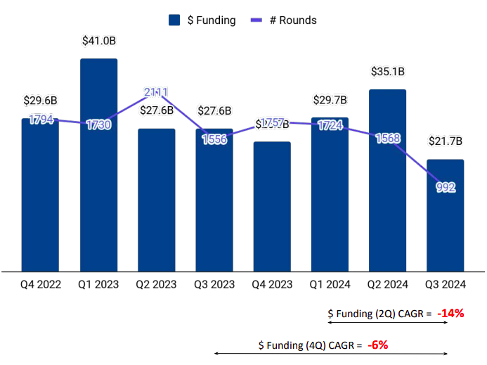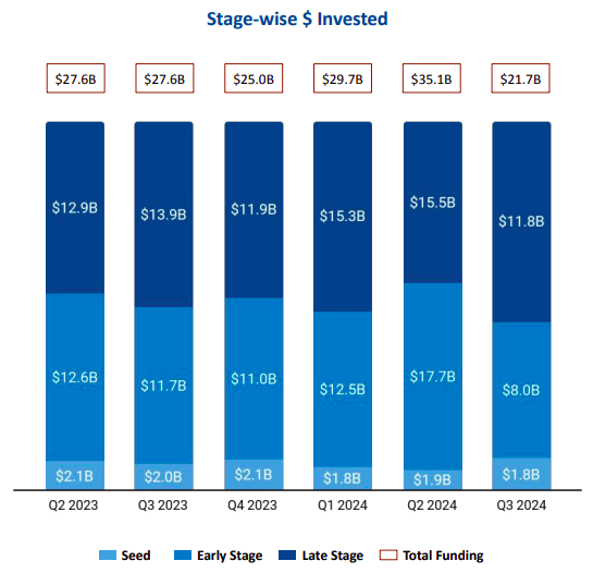 Late-stage funding fell 23.59% to $11.82 billion in Q3 2024 from $15.47 billion raised in the previous quarter. The ecosystem secured seed-stage investments worth $1.84 billion in the third quarter of this year, a minor drop of 1.6% compared with the $1.87 billion raised in Q2 2024. Early-stage funding fell 54.63% to $8.03 billion in Q3 2024 from $17.7 billion raised in Q2 2024.