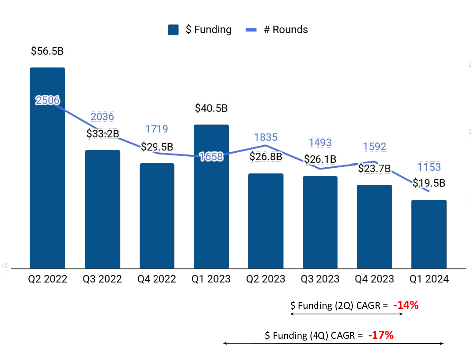Q1 2024 has witnessed a total of $19.5 billion in funding to date (till March 15, 2024), but a 46% plummet from $36 billion raised in the same period in Q1 2023 (till March 15, 2023). However, this is only 6% lower than the $20.7 billion raised in the same period in Q4 2023 (till December 15, 2023).