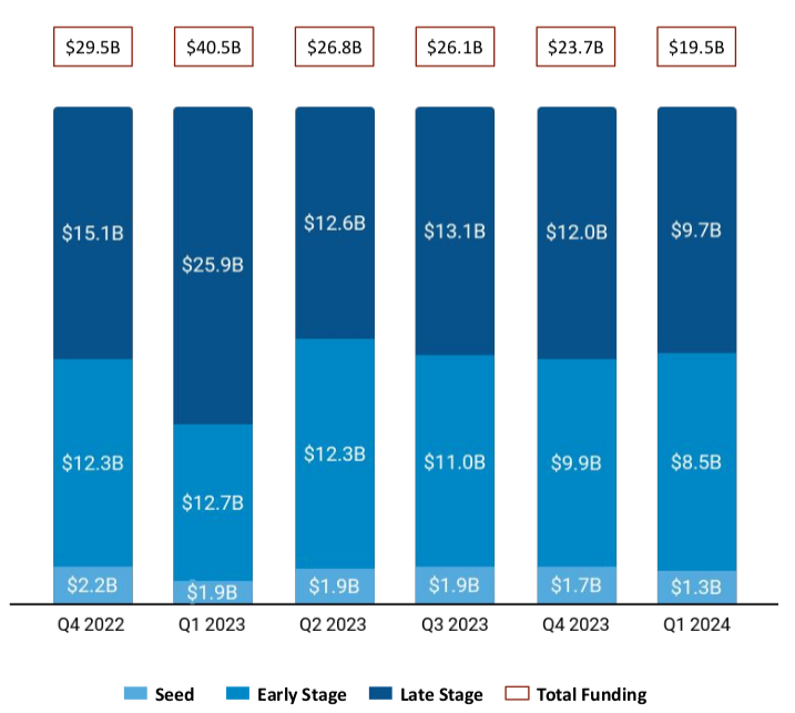 Seed-stage funding witnessed a decline of 21% to $1.3 billion in Q1 2024 to date from $1.6 billion in the same period in Q4 2023. Companies in this space attracted early-stage investments worth $8.5 billion in Q1 2024 to date, a 4% drop from $8.86 billion raised in the same period in Q4 2023. Late-stage funding stood at $9.7 billion in Q1 2024 to date, a minor dip of 4% from $10.1 billion raised in the same period in Q4 2023.