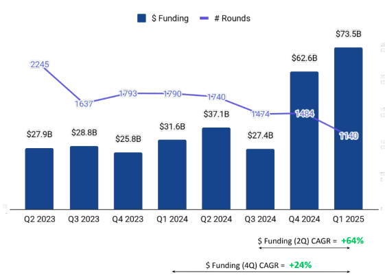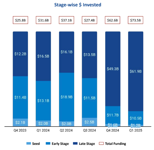 Seed-stage funding saw the steepest drop, totaling $1.2B, down 27% from $1.6B in Q4 2024 and 42% from $2B in Q1 2024. Early-stage funding dropped to $10.5B, declining 11% from $11.7B in Q4 2024 and 20% from $13.1B in Q1 2024. Late-stage funding reached $61.9B, marking a 26% QoQ increase from $49.3B in Q4 2024 and a substantial 275% YoY increase from $16.5B in Q1 2024.