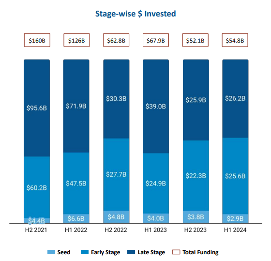 A similar pattern was observed in late-stage rounds as well. The sector attracted late-stage investments worth $26.2 billion in H1 2024, an increase of 2.7% from $25.9 billion raised in the latter half of 2023, but a plunge of 33% from $39 billion raised in H1 2023. Early-stage funding rose 15% to $25.6 billion in H1 2024 from $22.3 billion in H2 2023. This is also a 3.5% uptick from the $24.9 billion raised in H1 2023. Seed-stage funding stood at $2.9 billion in the first half of 2024, a drop of 25% from $3.8 billion raised in H2 2023 and 27% lower than the $4 billion raised in H1 2023.