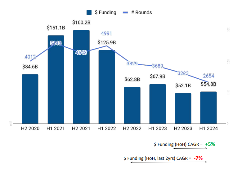 The US ranked first in H1 2024 in terms of country-wise startup funding, followed by the United Kingdom, China and India. The US Tech startup ecosystem raised a total of $54.8 billion in H1 2024, a 19% decline from the $68 billion raised in H1 2023. However, this is a 5.4% rise when compared with the $52.1 billion raised in H2 2023.
